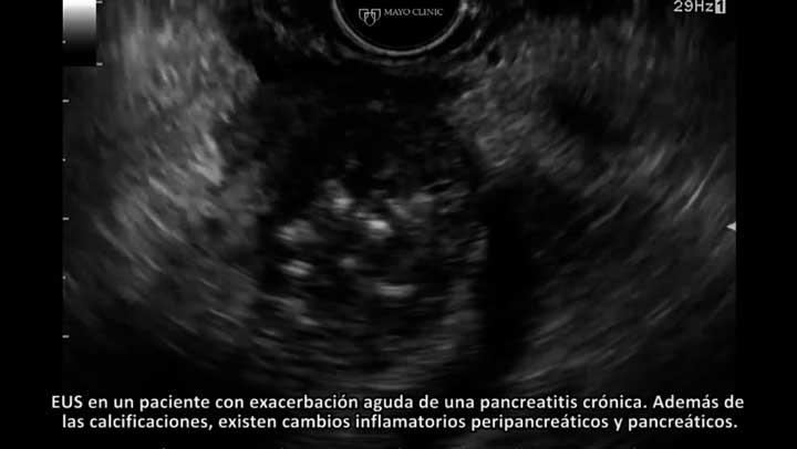 Video. 13.03 Hombre de 48 años de edad con evidencia clínica y por CT de pancreatitis crónica, una piedra ductal en la cabeza del páncreas y dilatación ductal proximal